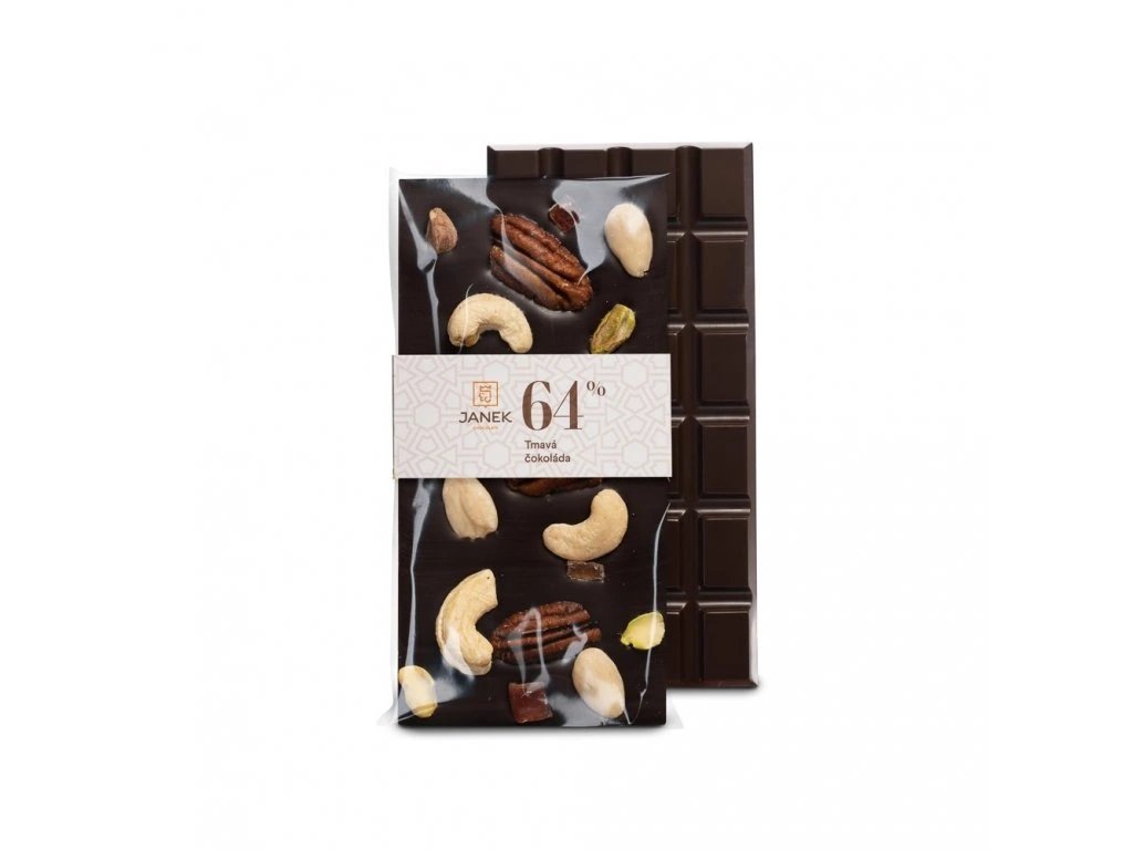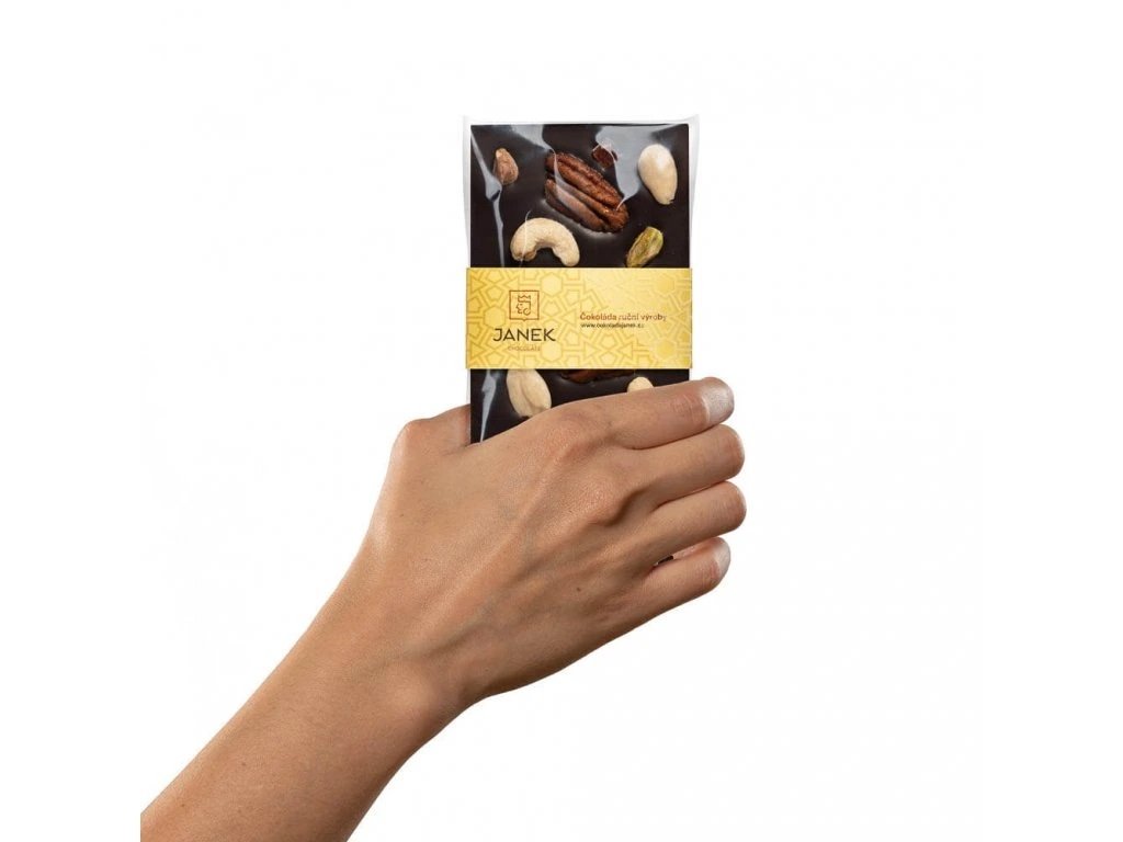Výrazná hořká čokoláda provoněná vanilkou. Žádnými aromaty nebo esencemi. Ale zrníčky pravé vanilky. K tomu přidejte ručně přebrané pekanové a kešu ořechy, pistácie, kousky sušené papayi a máte tabulku, která voní, křupe a zároveň se pomalu rozplývá na jazyku.
