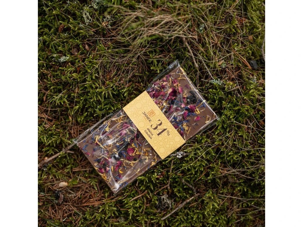 Mléčná čokoláda BYLINKOVÁ - měsíček, bez černý, chrpa, růže